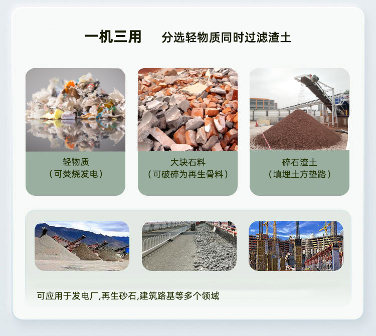 一直以來(lái),由于建筑裝潢垃圾的分選工藝不完善,建筑垃圾中含有大量的木料、布料、塑料、加氣塊等,這些輕物質(zhì)的存在影響了再生骨料的使用性能和應(yīng)用領(lǐng)域。生產(chǎn)得到的含有輕物質(zhì)的磚砼混合骨料只能作為低等級(jí)磚、道路墊層等低附加值應(yīng)用,限制了該行業(yè)的盈利能力, 制約了建筑垃圾資源化良性發(fā)展。